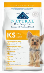 The Blue Buffalo Natural Veterinary Diet Kidney Support Grain-Free Dry Dog Food is vet recommended.